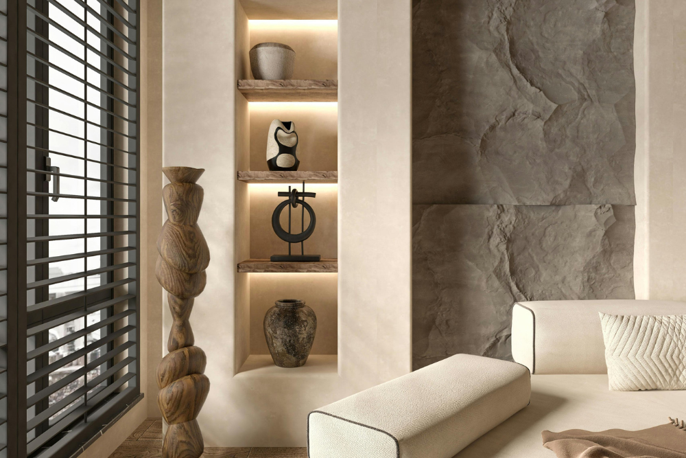 - Style open shelving with books + neutral ceramics.